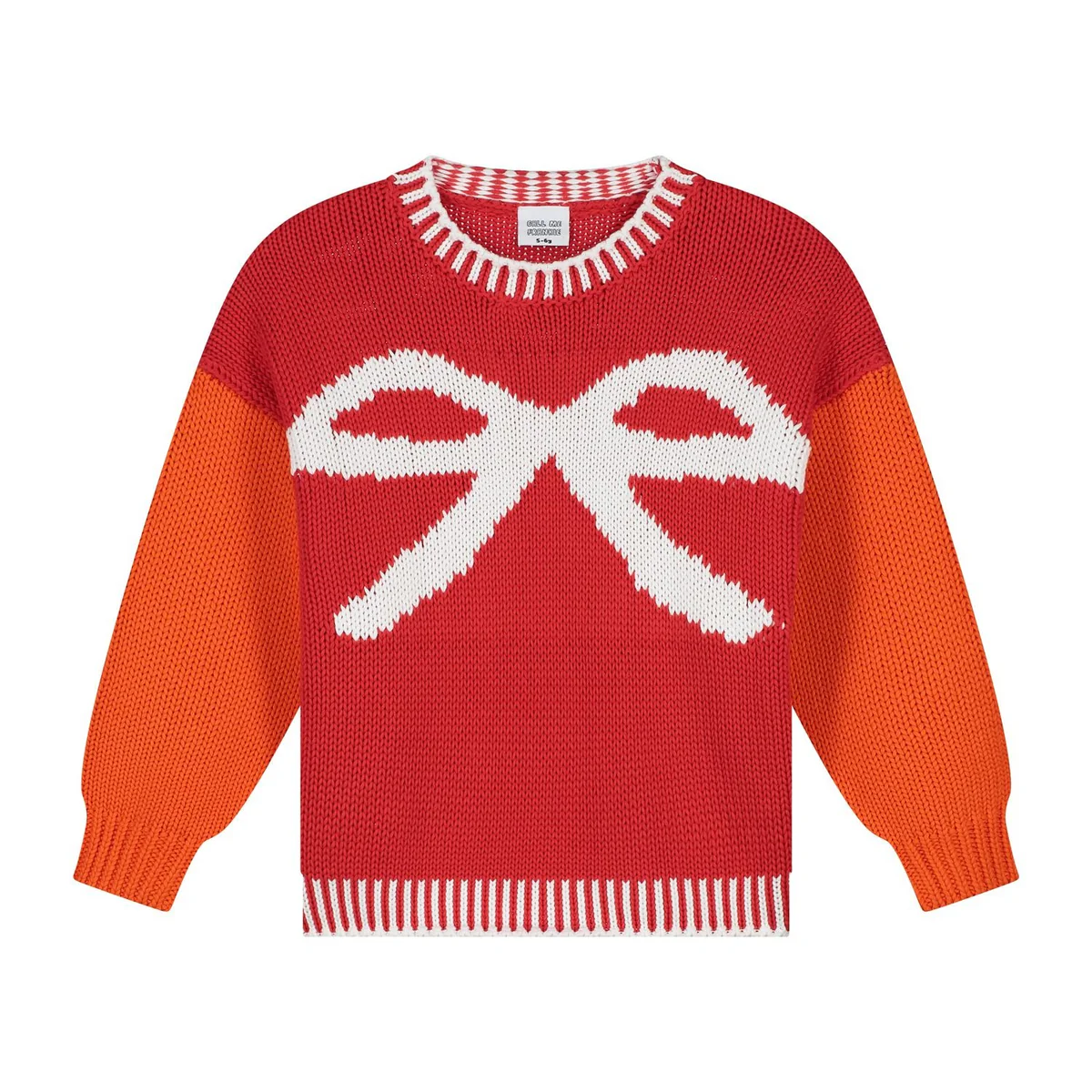 • This cozy knitted sweater is all about playful charm, with its bold red-and-orange color-block design and a striking oversized bow at the front. A statement knit that brings warmth and fun.