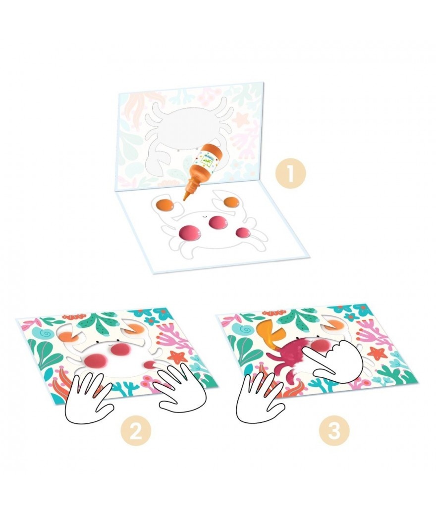 Een eerste verfdoos voor kinderen vanaf 18 maanden. Het kind opent het plastic boekje, giet er verf in en sluit het weer. Hij/zij kan de verf daarna leuk verdelen door met de vingers over het boekje te gaan om de dieren te schilderen zonder de handen vuil te maken! Nadien worden de boekjes afgespoeld met een beetje water en zeep en kan er opnieuw begonnen worden!