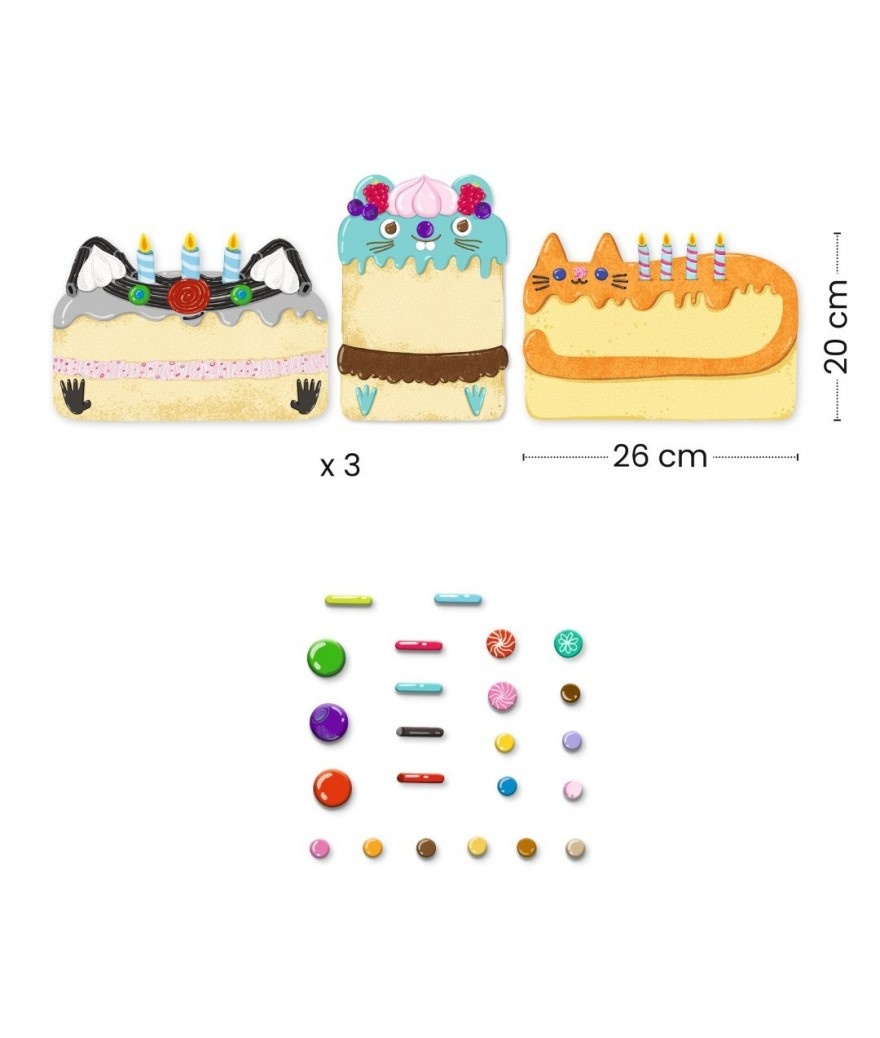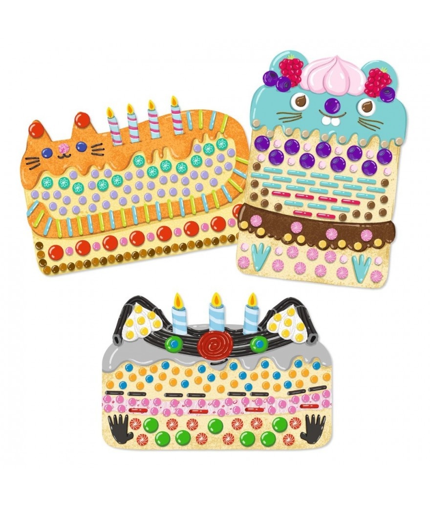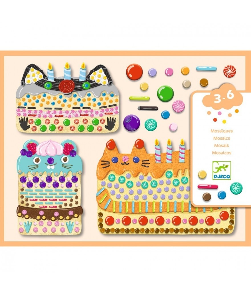Een plak-activiteit om hele schattige taartjes te maken en kennis te maken met mozaïek. Aan de hand van het boekje met uitleg plakt het kind de gekleurde en geïllustreerde stickertjes om de 3 silhouetkaarten te versieren.