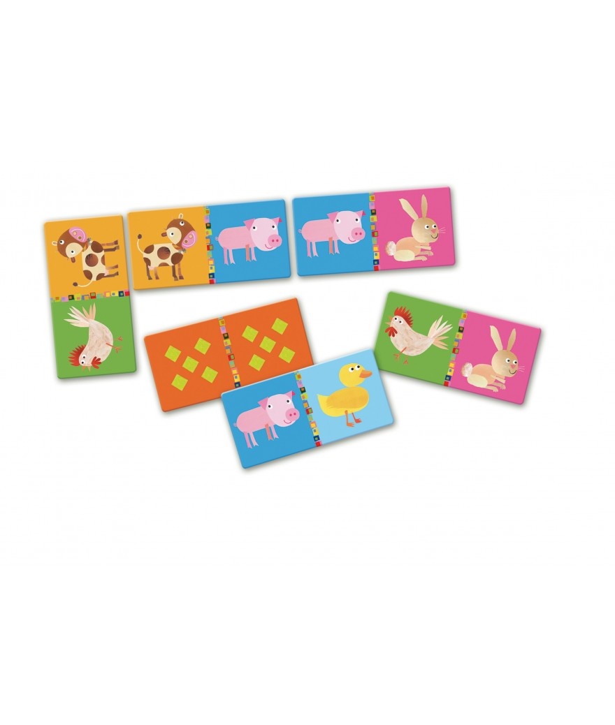 Domino Farm is een spel van beeldherkenning en getallenbenadering met dierenthema. Twee speelkanten: één kant met illustraties, één kant met sterren.