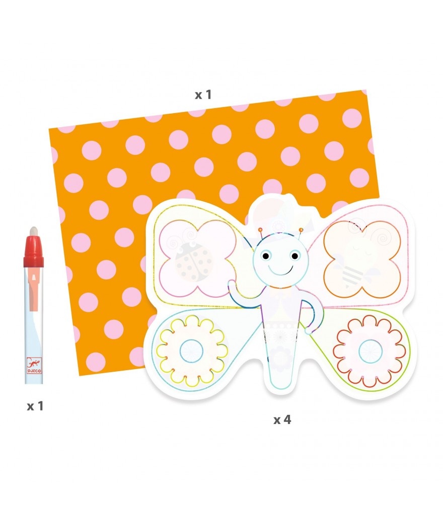 • Kleuren met water, geschikt voor kinderen vanaf 18 maanden. Het kind kleurt de dieren in met de waterpen en ontdekt wat er verborgen zit achter de witte zones. Magisch: er verschijnen patronen die van kleur veranderen! Wanneer de kleurplankjes droog zijn, kan het kind opnieuw beginnen!