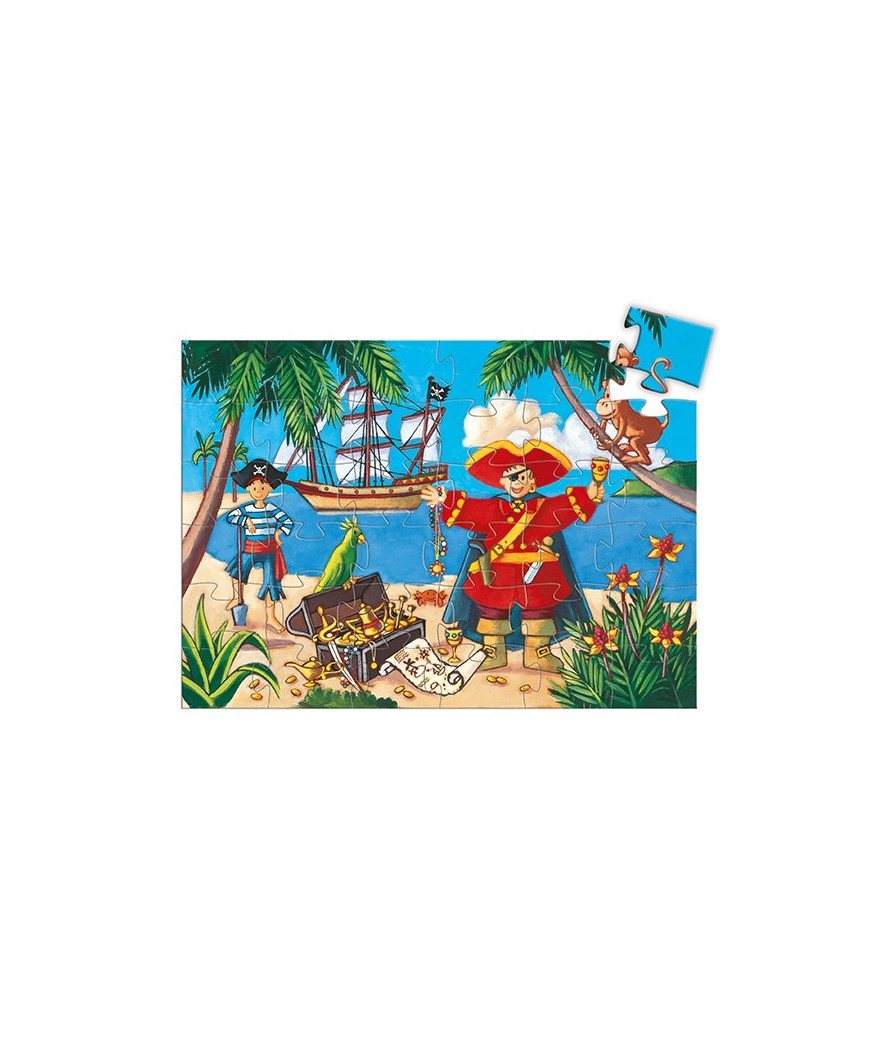 Een piraat gaat op zoek naar een schat met zijn papegaai. Een prachtige 36-delige puzzel in een elegante doos in de vorm van een piraat.