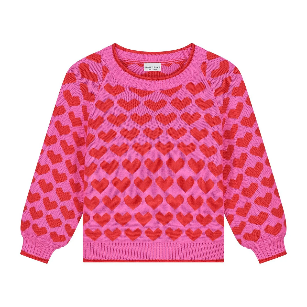 This bright pink sweater with bold red heart patterns is the ultimate mood booster for grey days and sunny ones alike. Made to spread love wherever you go. Part of set with the heart knitted pants.
