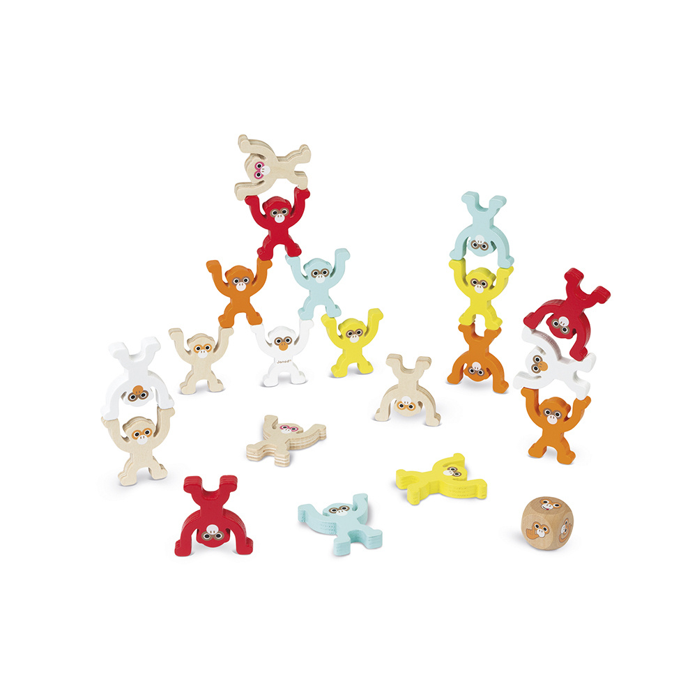 Behendigheidsspel Vanaf 3 jaar. 2 tot 5 spelers. Ziehier, 20 acrobatische apen van hout!! Maak je apenpiramide zo hoog mogelijk zonder dat ze omvalt. Maak de apen aan elkaar vast… via de armen of benen… met de kop omlaag of omhoog! De eerste die zijn acrobaten laat vallen heeft verloren!